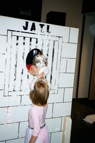 Michaela throwing a pie in the face of the Youth Director.